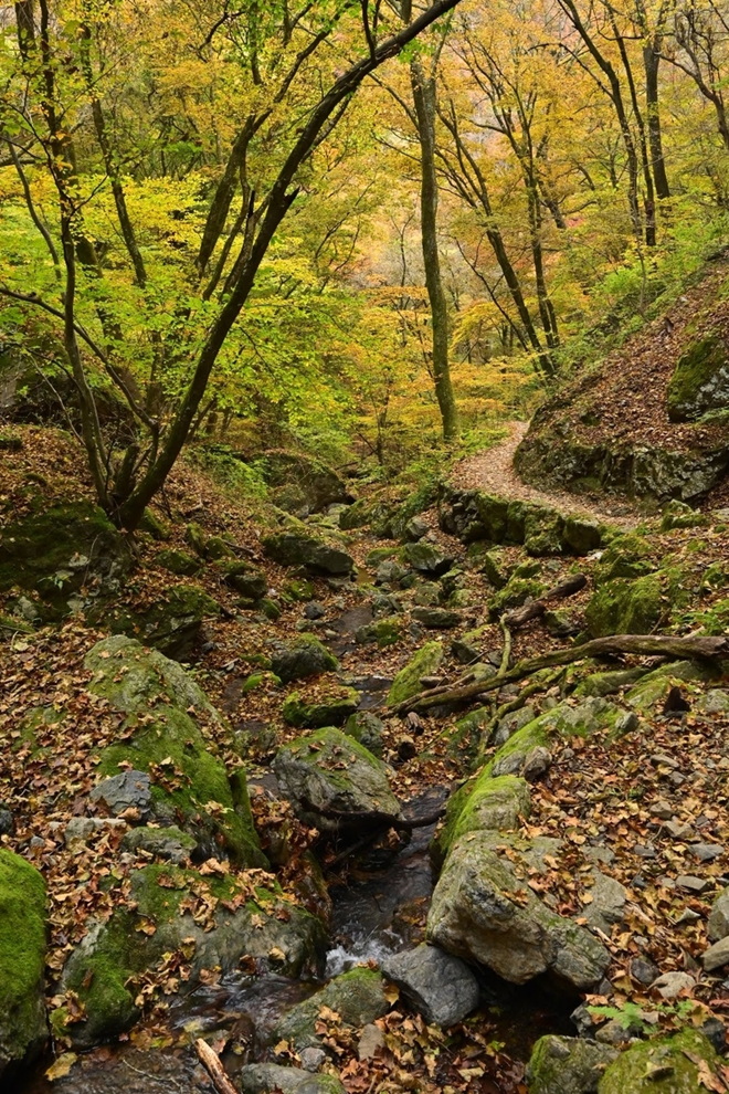清流が流れ、苔むした岩と紅葉が織りなす癒しの空間