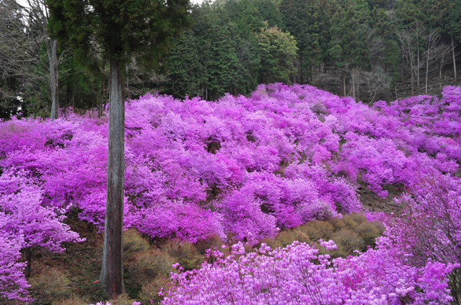 春の山麓を彩る、ミツバツツジの絶景