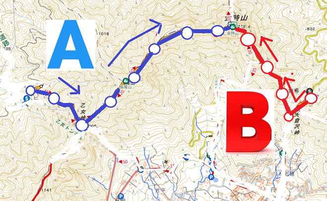 ● 標高差は Aコース(416m)に比べ ⇔ Bコース(372m)