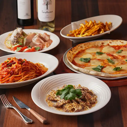 ■日替わりの前菜盛り合わせ ■ サラダ グリーンサラダ シチリア産レモンドレッシング ■ フライ ポテトフライ チーズと黒胡椒で ■ ピッツァ モッツァレラチーズとバジルのマルゲリータ ピッツァ ■ パスタ ベーコンと茸のボスカイオーラスパゲッティー
