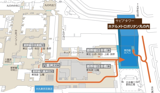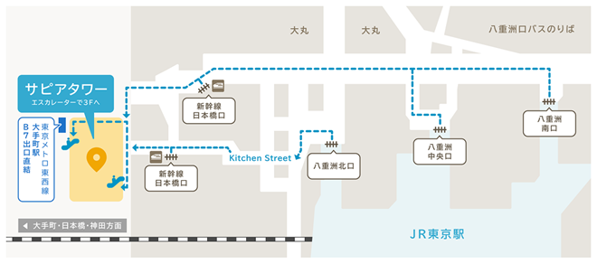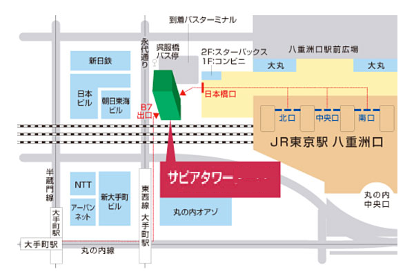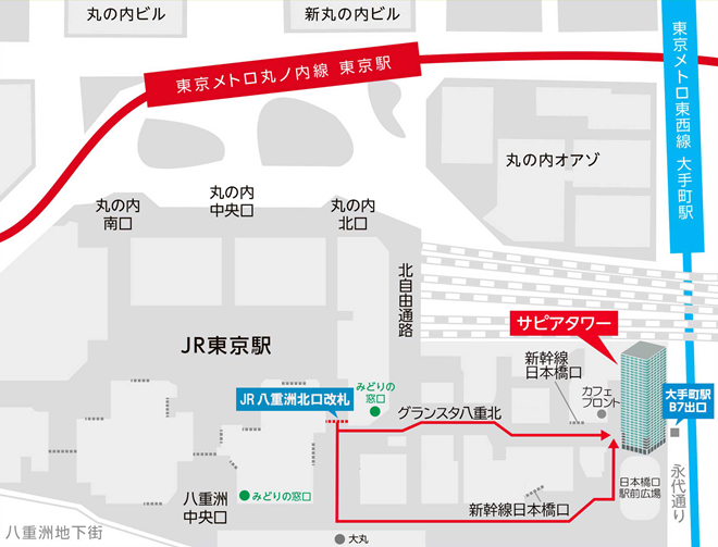 ◆ JR東京駅 日本橋口 徒歩1分 ◆ 東京メトロ大手町駅 B8出口付近「サピアタワー連絡口」直結