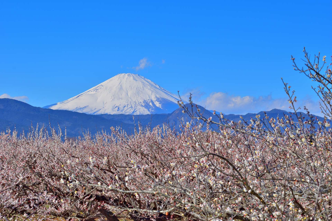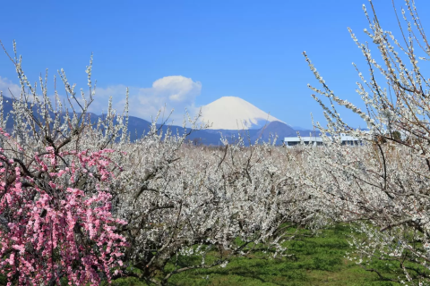富士山を背景に一面の梅が咲く壮観な景色が人気です。