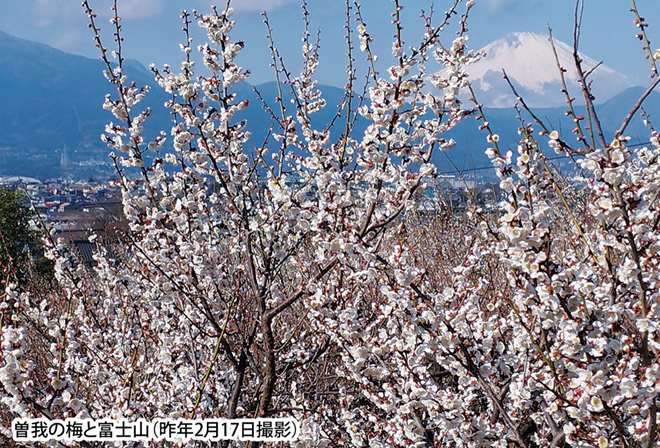 曽我梅林では富士山を背景に梅を眺めるスポットも人気
