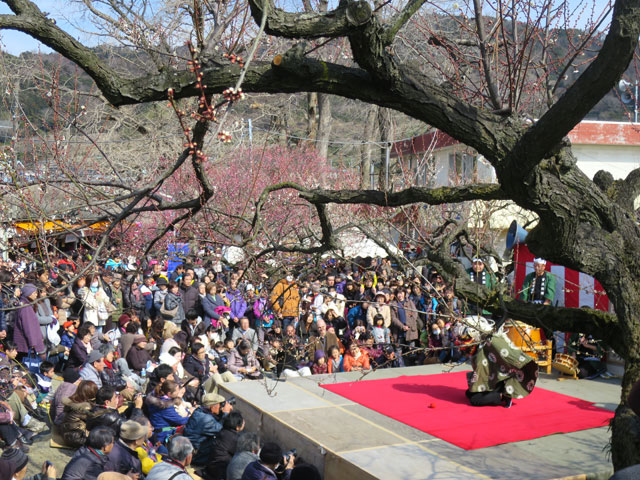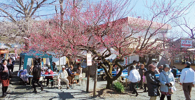 富士山を背景に梅の花見、屋台・特産品の販売、地元イベントなど
