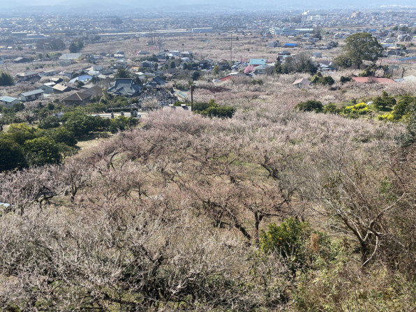 関東でも最大級の梅林として知られ、約35,000本の梅の木が山裾に広がります。