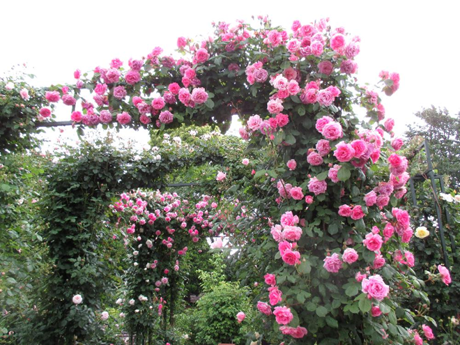 つるバラやスタンダード仕立てのバラが織りなす、華やかで立体的な景観も大きな見どころです