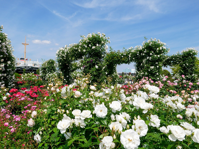 港に係留された日本郵船氷川丸の目の前に位置し、約160種・1,900株ものバラが咲き誇ります