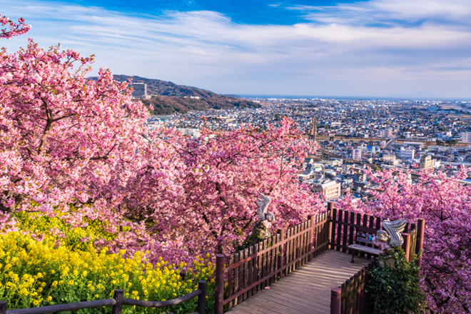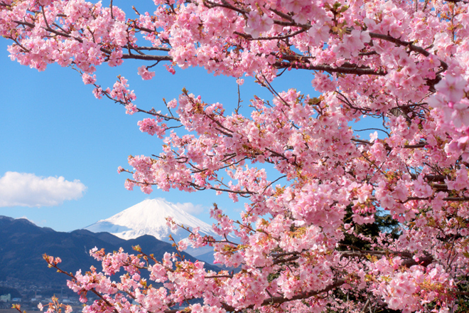 天気の良い日には、河津桜越しに富士山を眺めることができ、日本らしい絶景を一度に楽しめます