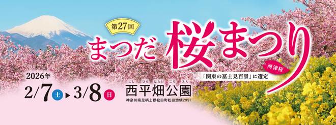 約360本の河津桜と菜の花が松田山を一足早く春色に彩る『まつだ桜まつり』が、次の通り開催されます。