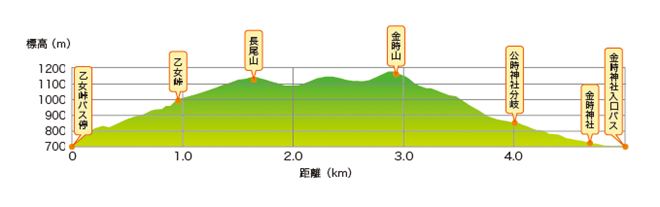 (A・Bコース) くだり: (山頂: 1211m) → (金時神社入口 699m) 標高差512m 歩行時間 1時間30分