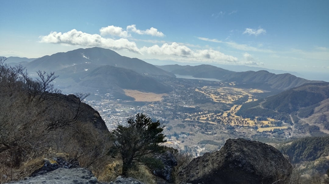 道には木の階段がつけられ、歩きやすい。振り返ると大涌谷の噴煙が見え、登るにつれて仙石原の全容が見える