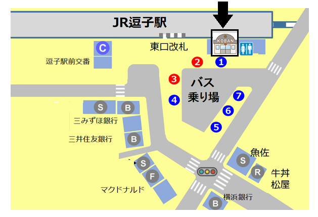 JR横須賀線 逗子駅東口 「逗子駅前交番」前に集合です 東口改札口そば(1番バス乗り場前)