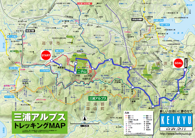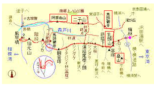 阿部倉山・二子山から森戸林道終点を経て中尾根ルートを登り返し、乳頭山・畠山を経由して「京急安針塚駅」に至る縦走コースです。
