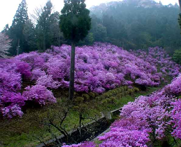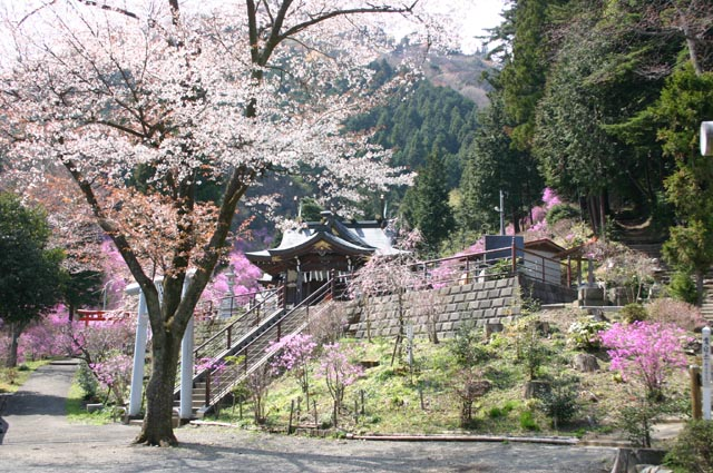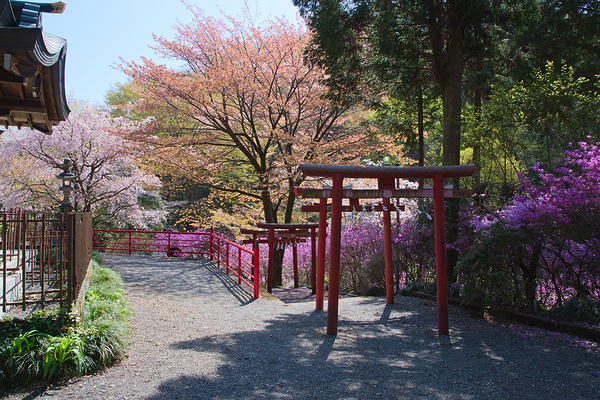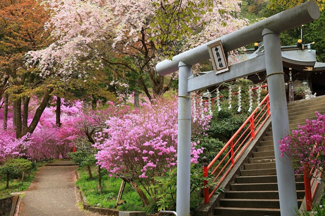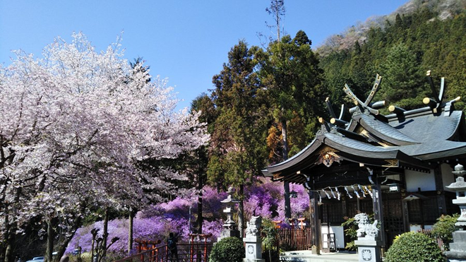 神社の周辺にはミツバツツジがたくさんあり、花の時期には素晴らしい景色が見られます。斜面一面がピンク色に染まってみえます