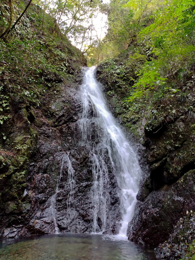 急勾配の山道をとおり河原を遡ると奥地に滝が見えます