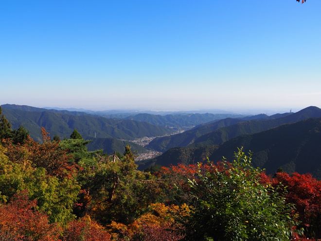 山頂は360度の展望が開けており、紅葉に包まれた奥多摩の山々、条件が良ければ遠く都心やスカイツリーまで眺められます。