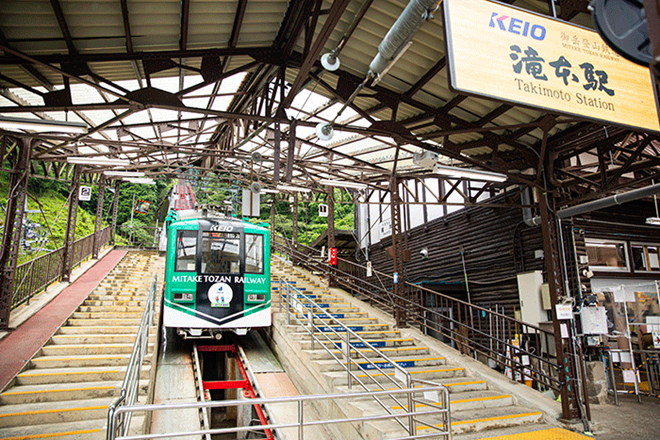 滝本駅から御岳山登山鉄道(ケーブルカー)に乗車し、約6分で標高831mの御岳山駅に到着。
