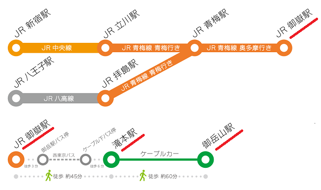 JR御嶽駅から西東京バス[ ケーブル下行き ]乗車 終点下車。御岳登山鉄道ケーブルカー滝本駅から乗車 終点下車。
