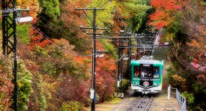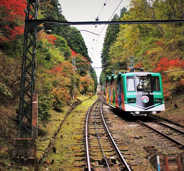滝本駅(標高407m)から御岳山駅(標高831m)まで、標高差約424m、所要時間約6分で運行しています。