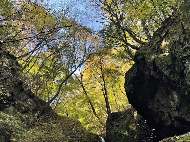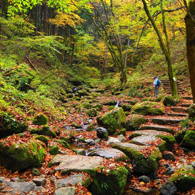 苔むした巨岩や奇岩の間を天狗岩から綾広の滝まで沢沿いに歩くロックガーデンハイキングコースは、紅葉狩りにもおすすめ
