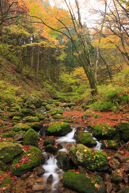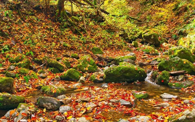 清流が流れ、苔むした岩と紅葉が織りなす癒しの空間──