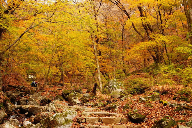 紅葉の中でハイキングを楽しむことができます。色々なコースがありますが、特に苔むした岩間を歩くロックガーデンコースがおすすめです。 紅葉の種類 オオモミジ、カエデ、コナラ