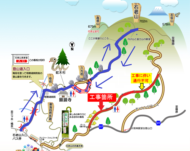 ■ 本コースは現在、山頂からの下山道「一部登山道の工事通行止め」に伴い、従来利用可能であった下山道のトイレが使用できません。